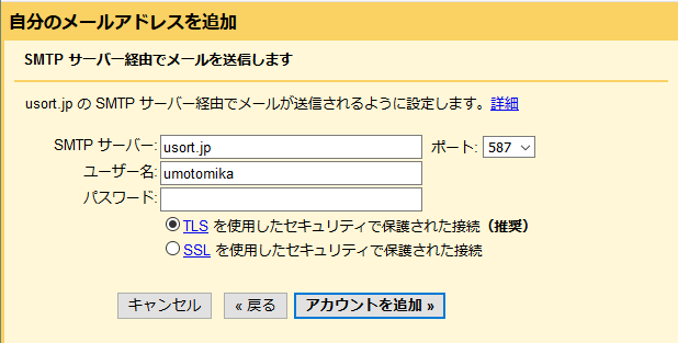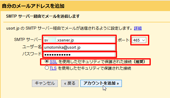 SMTP サーバー : 先ほどメモしておいた送信メール(SMTP)サーバー