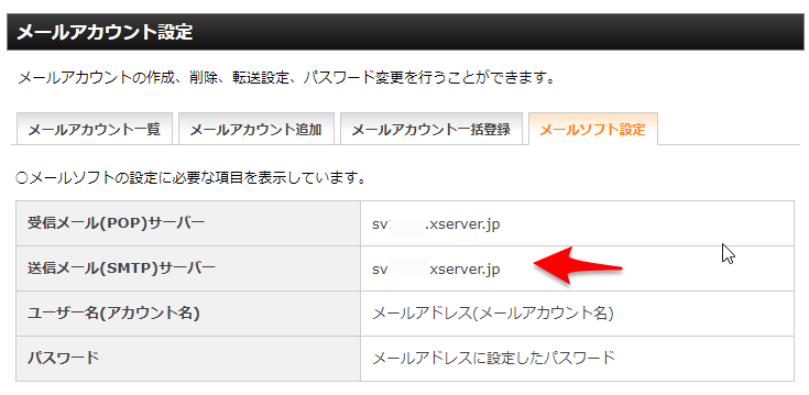 赤矢印の送信メール(SMTP)サーバーをメモしておいて下さい。