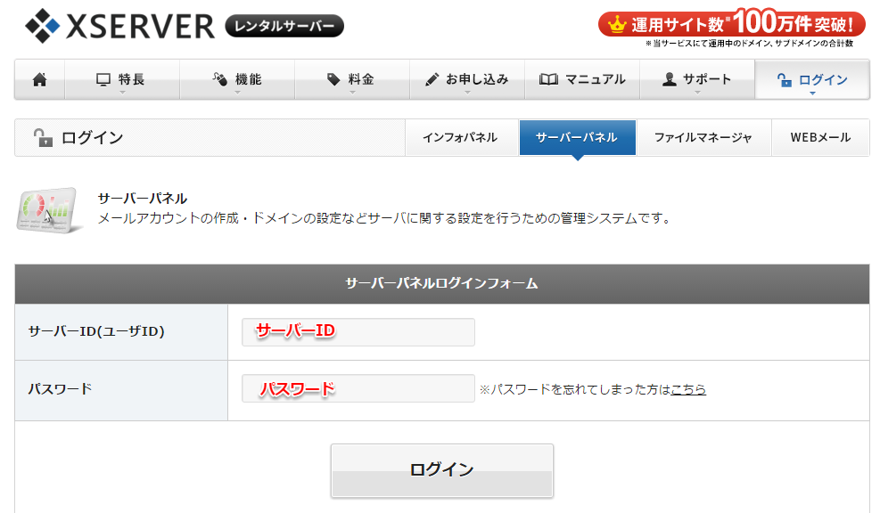 ログイン画面になるので、メールにあったサーバーIDとパスワードを入力して ログイン をクリック
